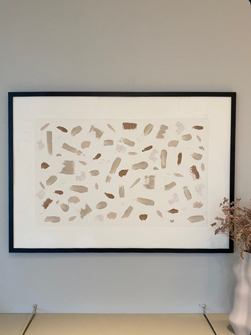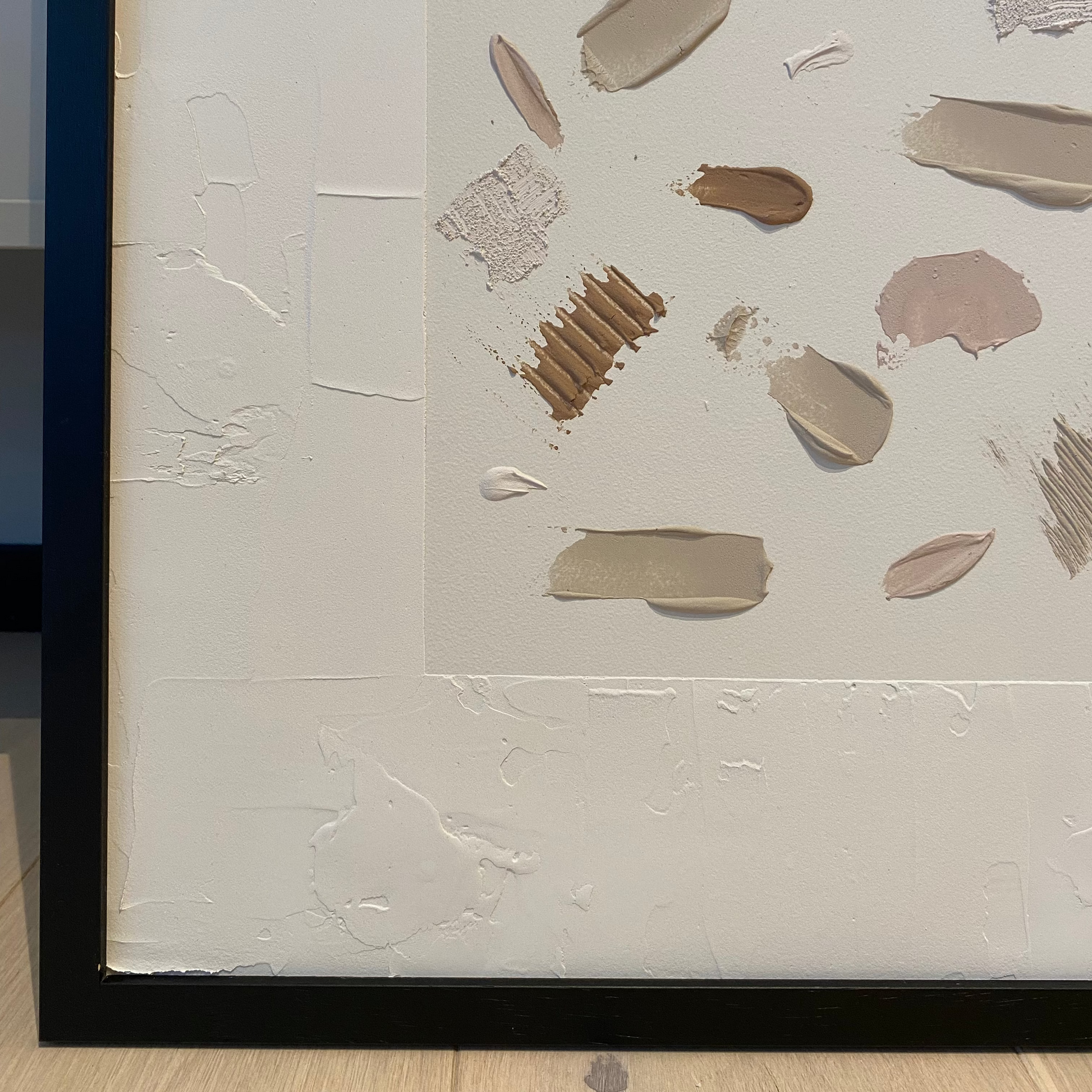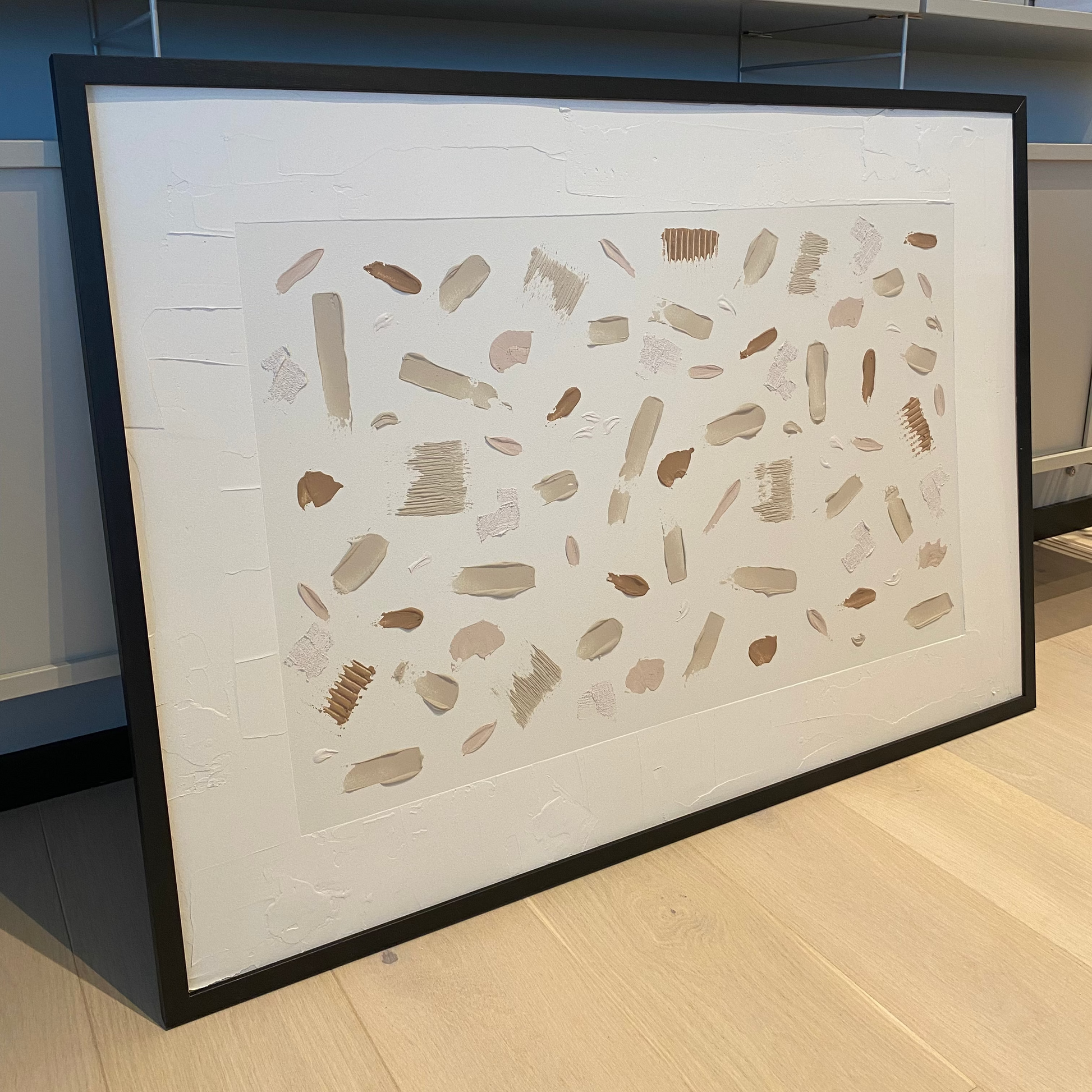 The piece is framed with a hand-sculpted plaster passepartout and enclosed in a black wooden frame, enhancing its architectural presence. The interplay of textures and muted shades evokes a sense of natural balance and Scandinavian simplicity — where structure meets spontaneity.
