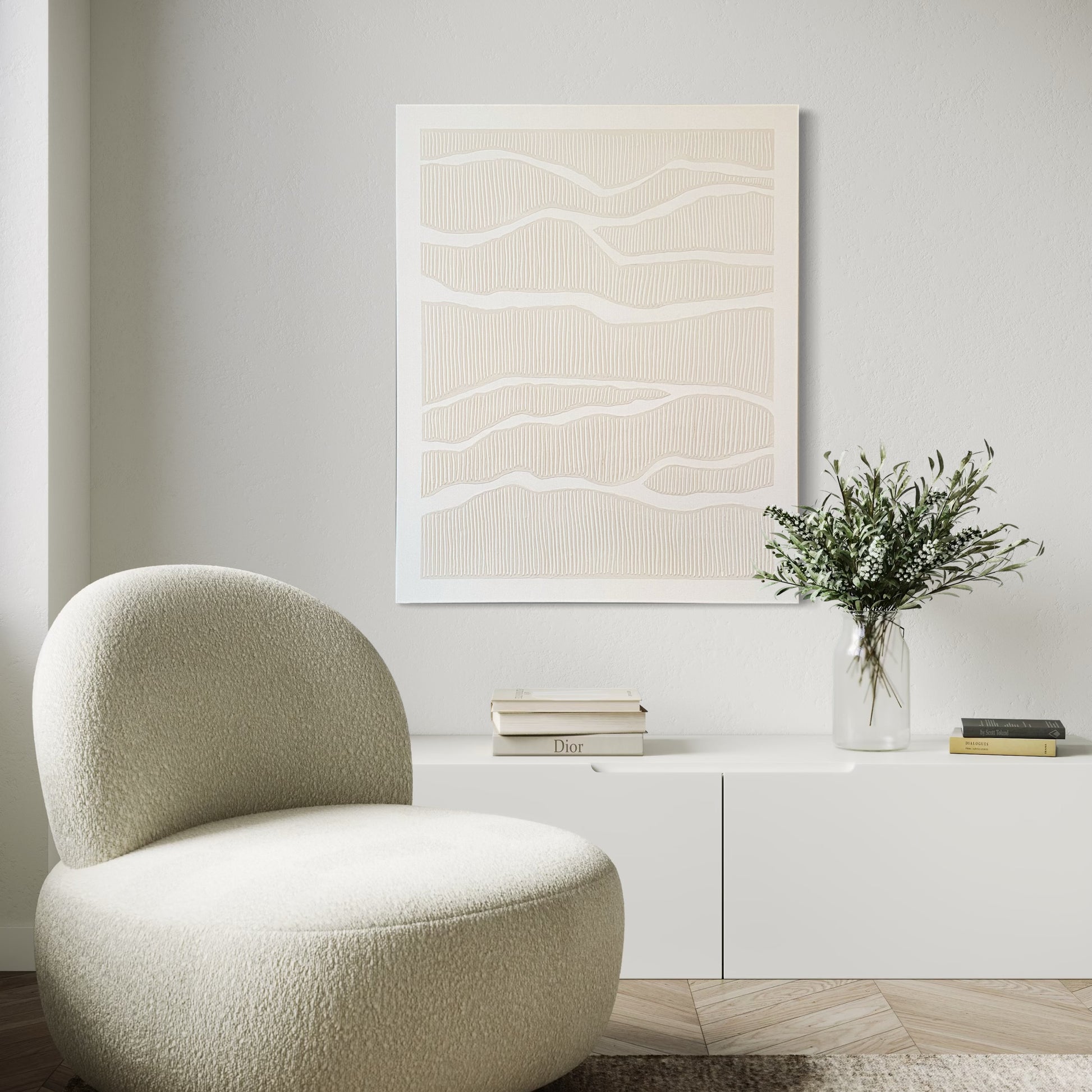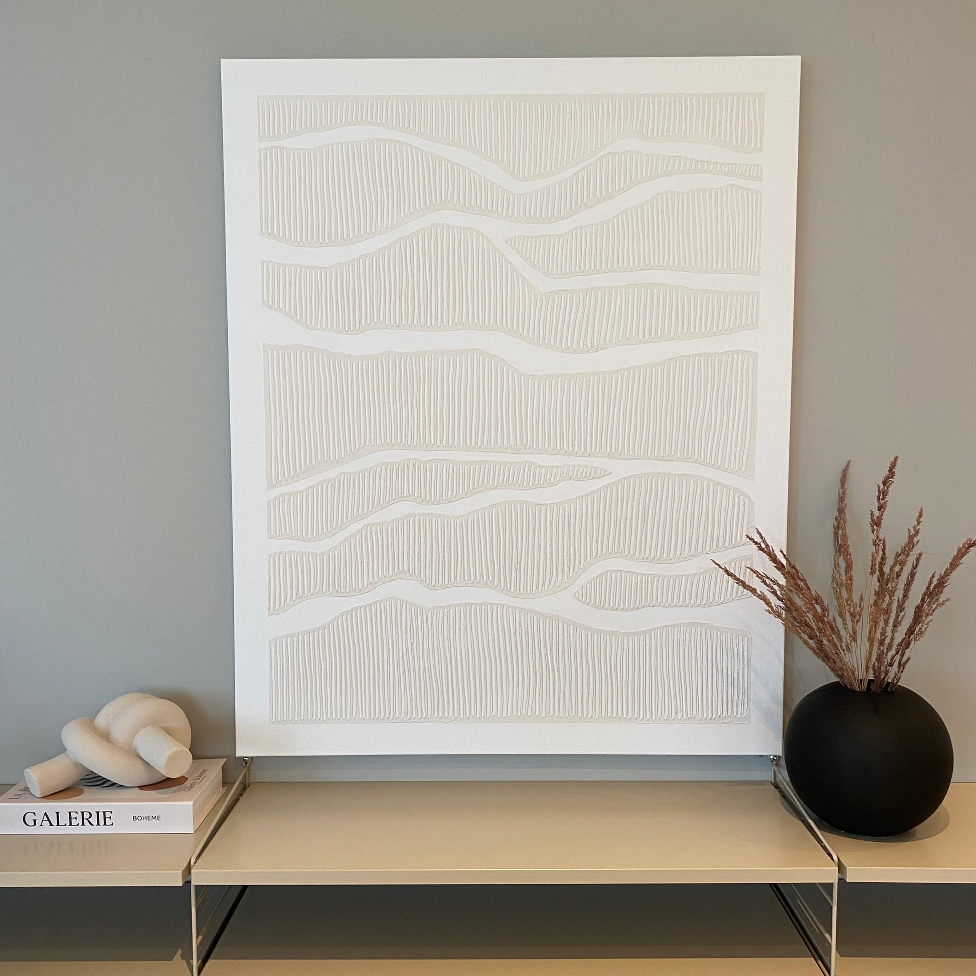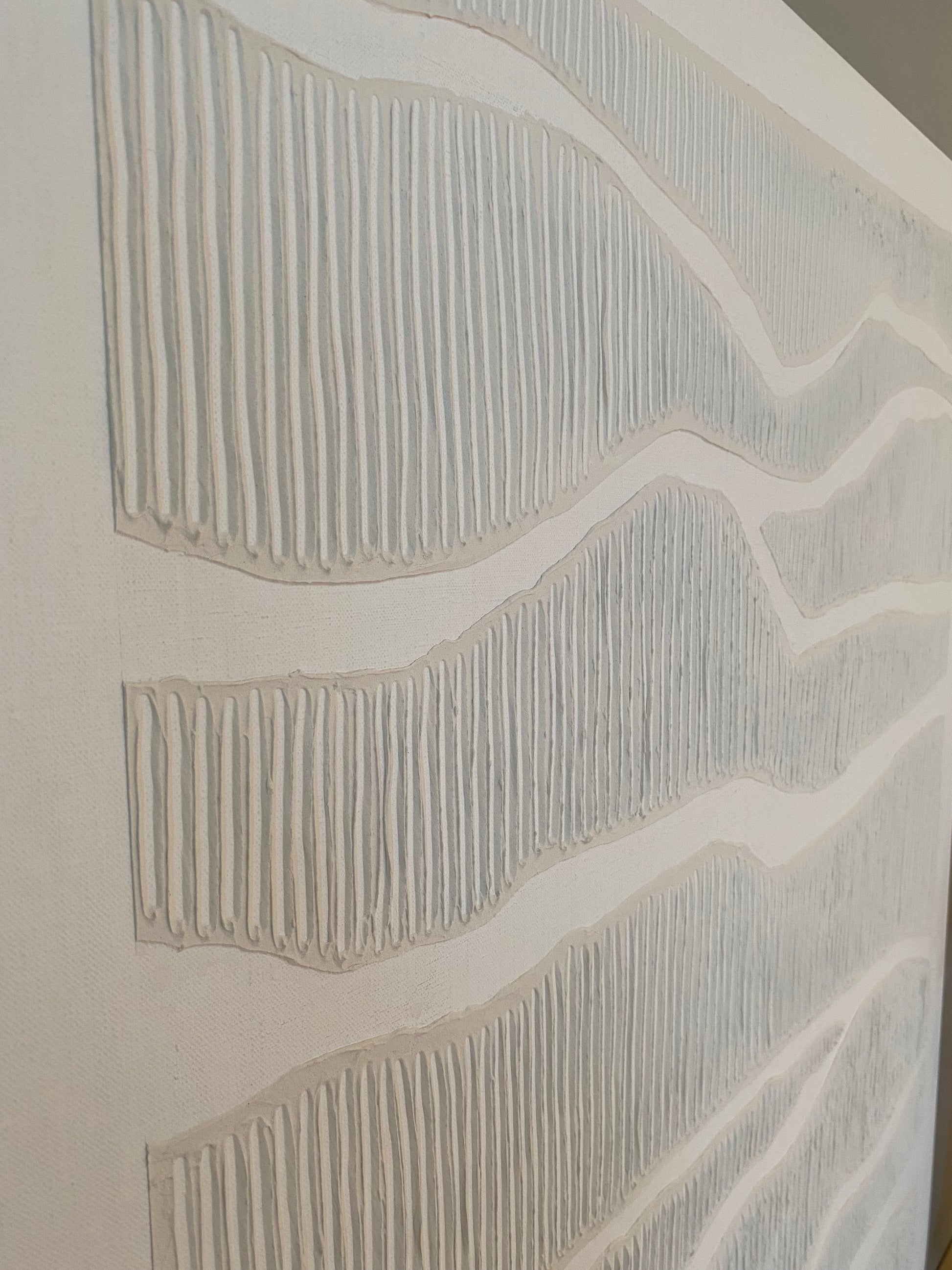 This original painting on 100x81 cm canvas is created using modeling paste and acrylic paint, featuring horizontal wave-like textures combined with a subtle vertical stripe pattern.