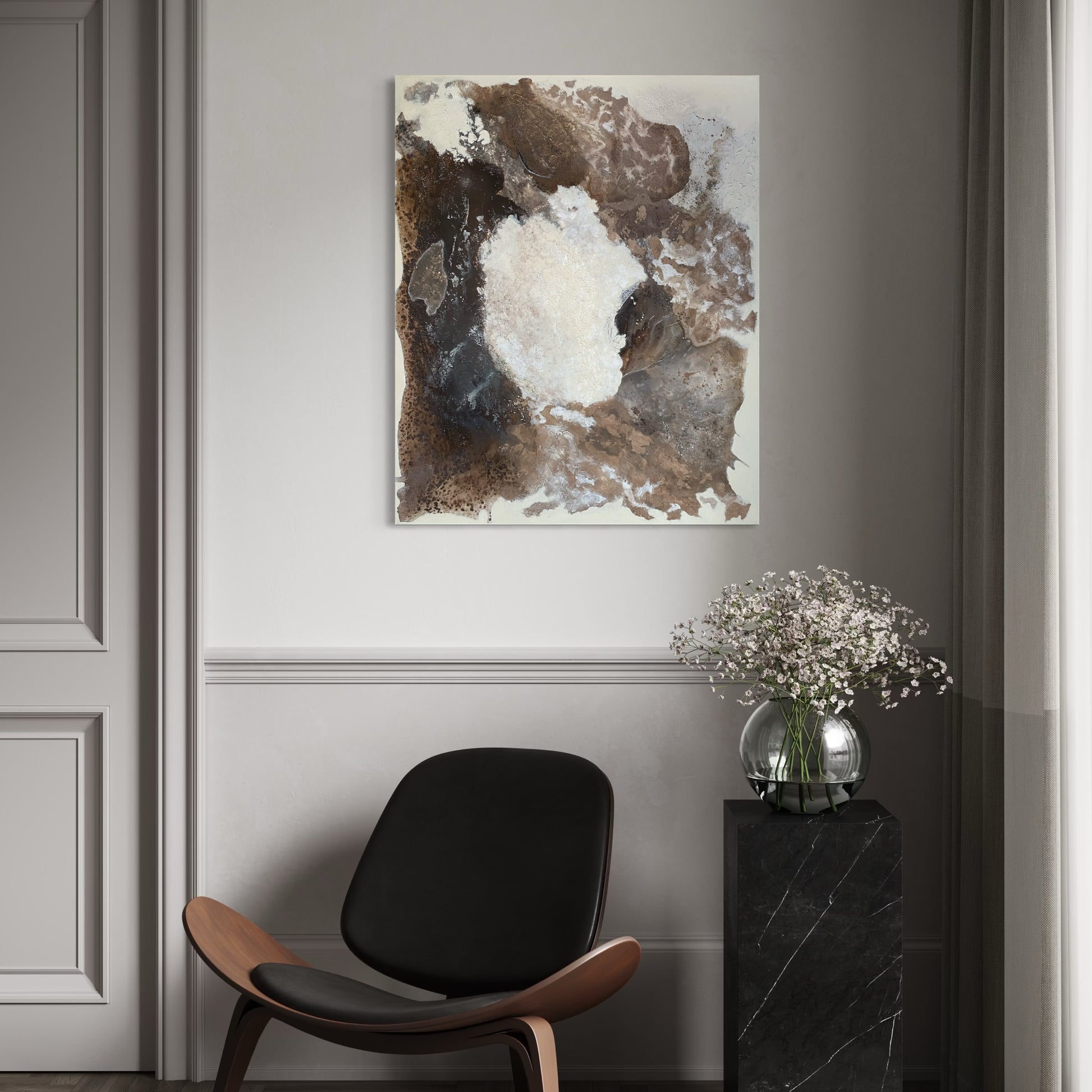 MOCHA / 03 is a handmade painting using acrylic paint, texture paste, soft pastels and coffee. Warm coffee browns and creamy neutrals form organic shapes and layered textures that give the surface tactile depth and movement. This one‑of‑a‑kind piece adds grounded elegance to modern or Scandinavian interiors.
