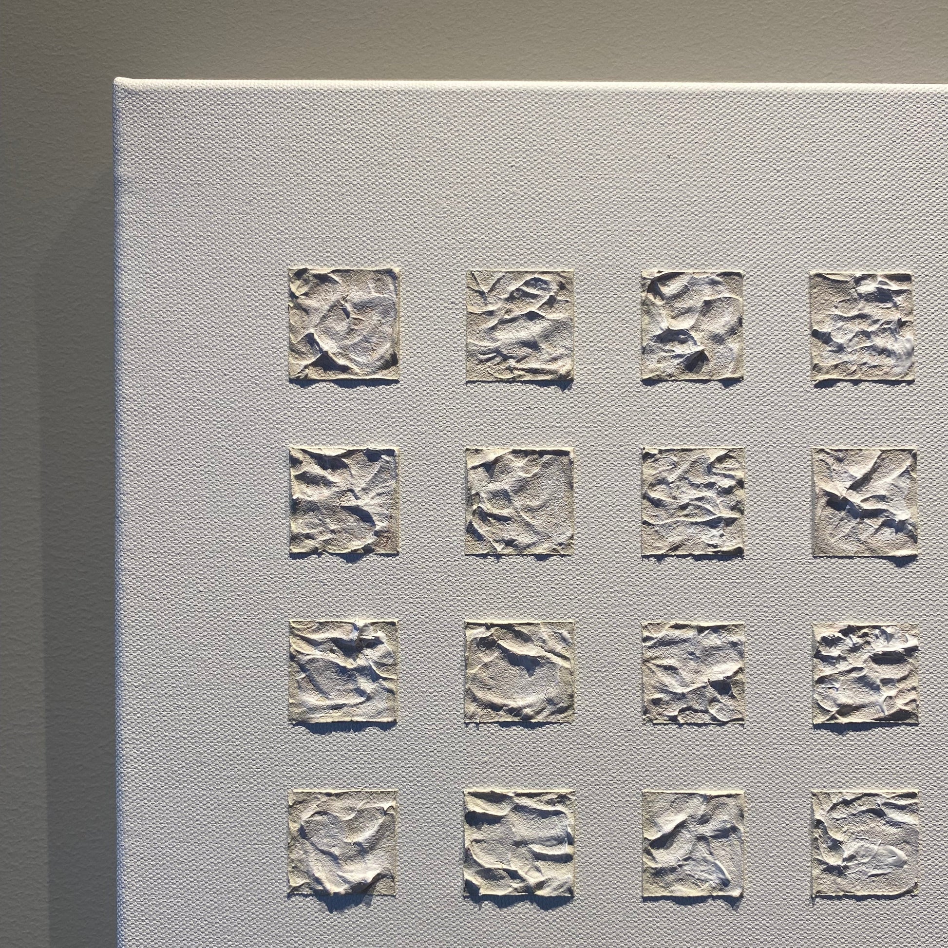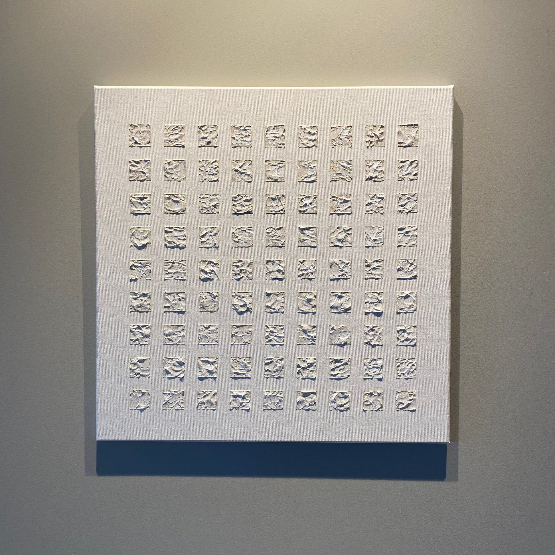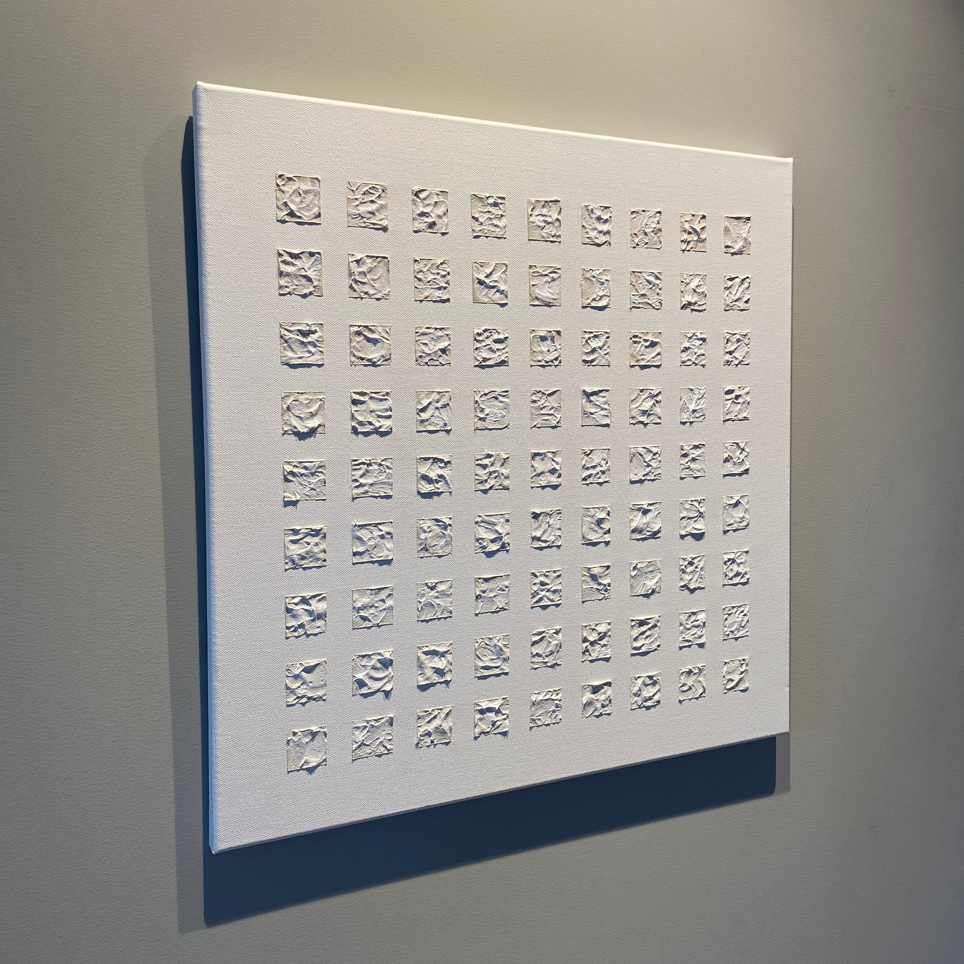 Created on a 50x50 cm canvas, the piece features a grid of tactile, sculpted forms made from modeling paste and acrylic. Each square holds a unique texture, subtly reflecting light like snow crystals in soft winter sun.