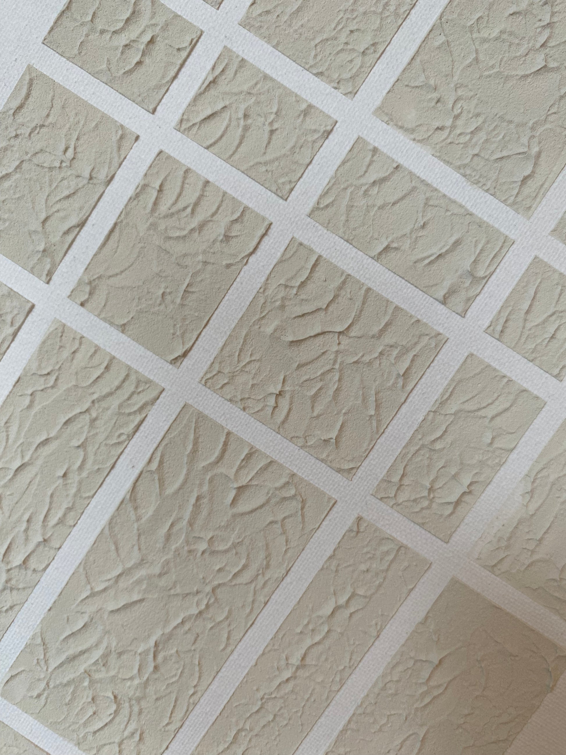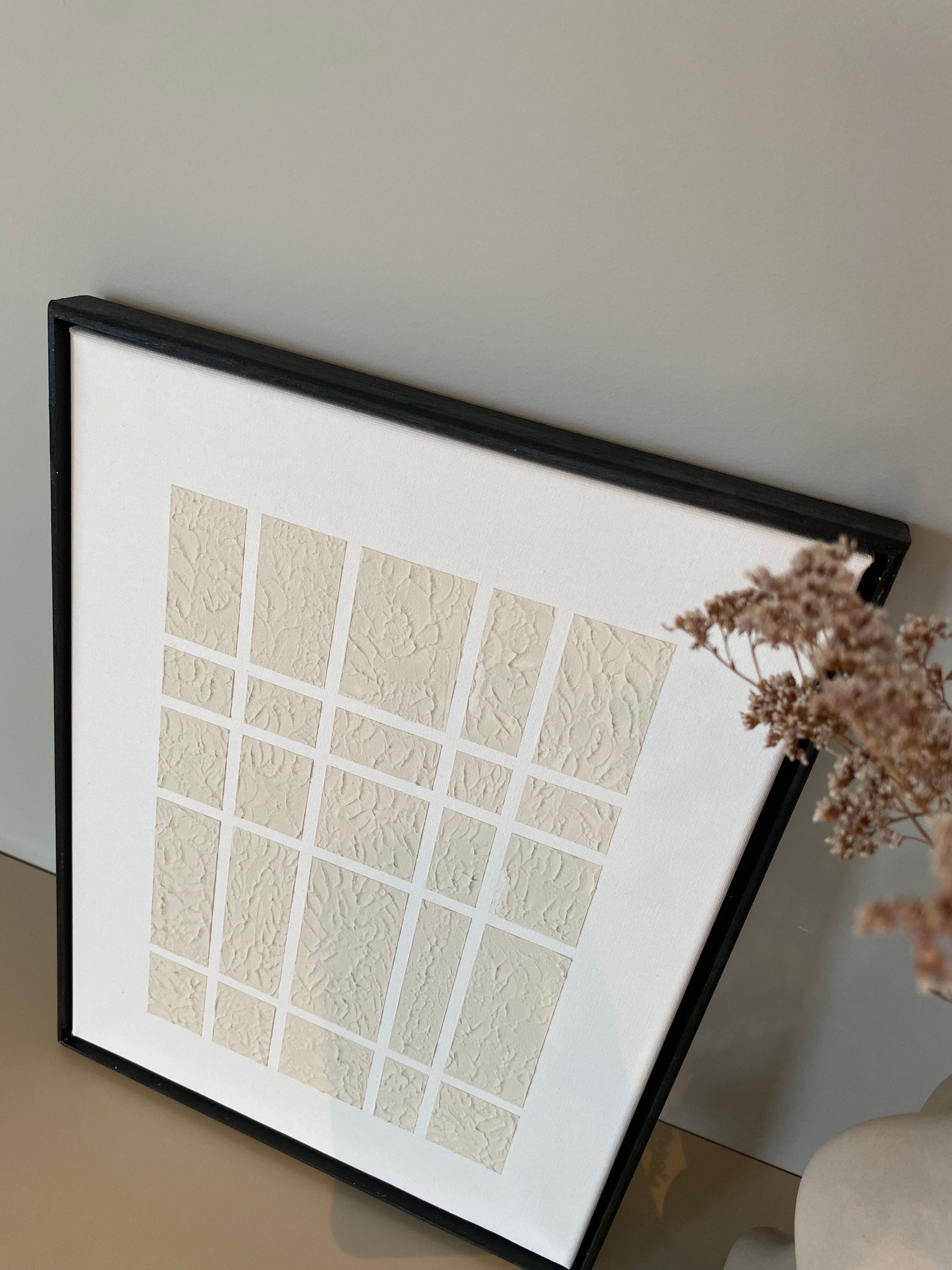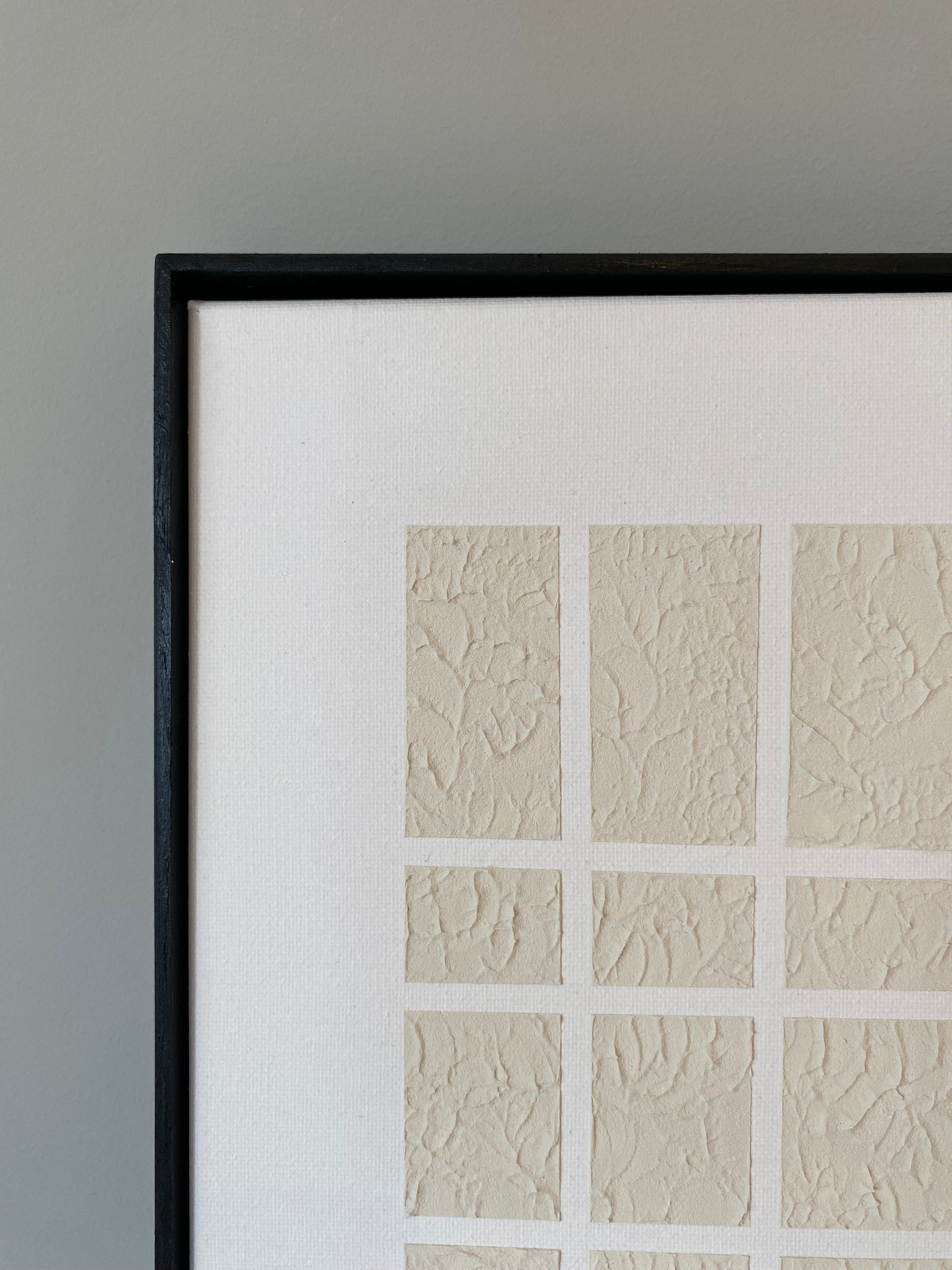 This original artwork on 40x30 cm canvas combines precise geometric composition with organic texture, creating a balanced dialogue between structure and movement. The grid pattern is filled with delicately modeled sections of textured material, giving each square a unique depth and tactile presence.